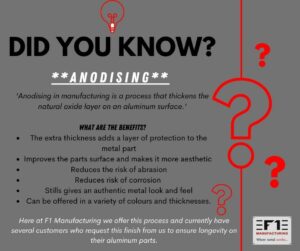 Anodising is a process we offer to our customers here at F1. For more information on what processes we have to offer please visit our